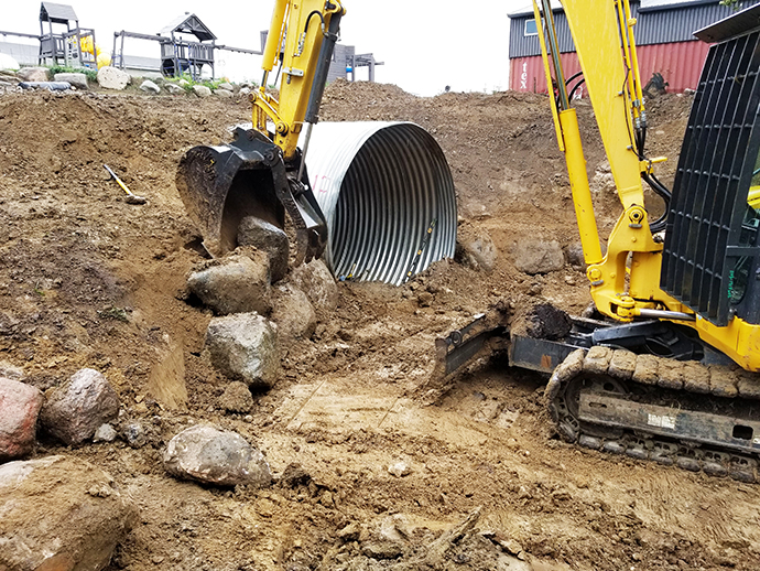 The project placed over 3,000 tons of boulders. Some of them weighed 15,000 lbs. “Occasionally we used the PC88 and PC138 together to lift them into place.”